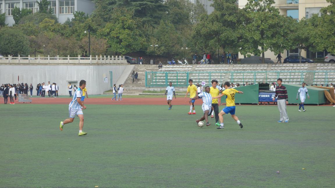 上半场为国际教育学院留学生队与校教工队的比赛,下半场的交流赛则在卫岗校区学生队与国际教育学院留学生队之间展开。场上队员们奋力拼搏,场下观众热情加油,气氛热烈。