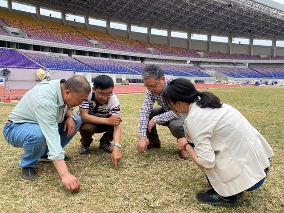 2021年5月7日,李俊龙一行赴杭州考察了2022年亚运会开闭幕式主会场杭州黄龙体育馆的草坪,该体育馆的草坪草均来自我校句容草坪研究院生产的耐践踏草坪草。杨志民与现场施工人员进行了交流,并结合该草坪草的特点对草坪建植现场存在的问题及后期的养护管理给出了指导意见和建议。