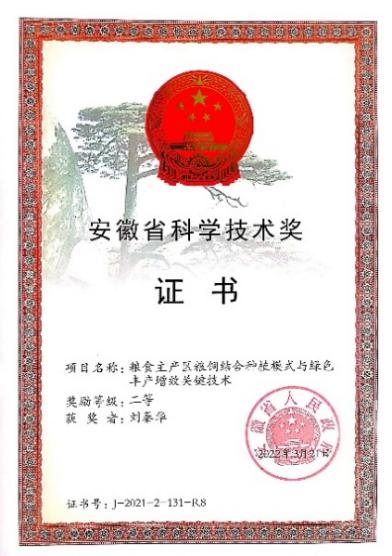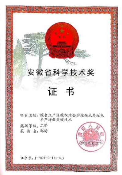 为第二完成单位的研究成果“粮食主产区粮饲结合种植模式与绿色丰产增效关键技术”获得安徽省科学技术奖二等奖。