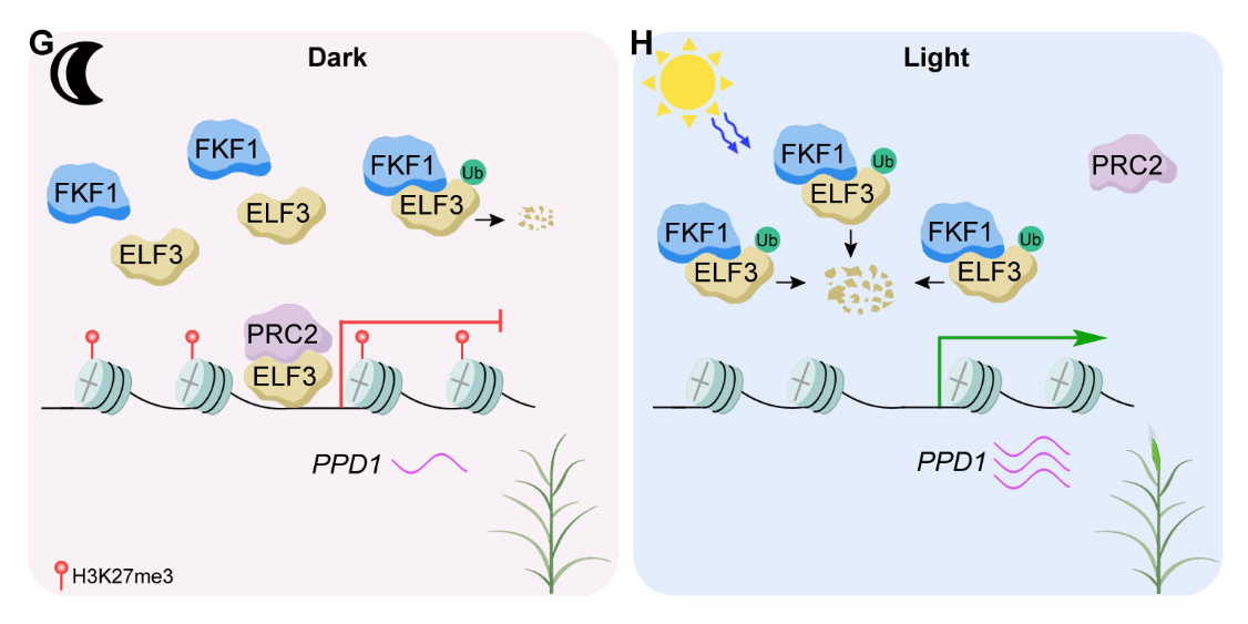 PRC2蛋白复合物负责催化形成组蛋白H3K27me3修饰,抑制靶标基因转录。SWINGER (SWN)和CURLY LEAF (CLF)是PRC2蛋白复合体的两个核心亚基。进一步研究发现,在黑暗环境中稳定积累的ELF3蛋白,能够与SWN和CLF发生特异性互作。这种互作将SWN和CLF招募至下游开花促进因子PHOTOPERIOD 1 (PPD1)的启动子区域,从而建立起组蛋白H3K27me3修饰,降低PPD1基因的表达,最终实现对植物开花的抑制。而在光照条件下,蓝光受体FKF1直接降解ELF3蛋白,解除其对下游PPD1基因的转录抑制作用,诱导植物开花。尤为重要的是,该调控机制在包括小麦和燕麦的其他温带草类植物中表现出高度保守性,暗示其在温带草类植物开花调控中的普遍意义。