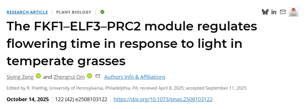秦正睿教授课题组在《美国科学院院刊》(PNAS)上发表了题为“The FKF1-ELF3-PRC2 module regulates flowering time in response to light in temperate grasses”的研究论文。该研究深入解析了光信号调控温带草类植物开花时间的分子机制及其表观遗传学基础,为今后培育高产、优质、广适的饲草品种奠定了重要理论基础。