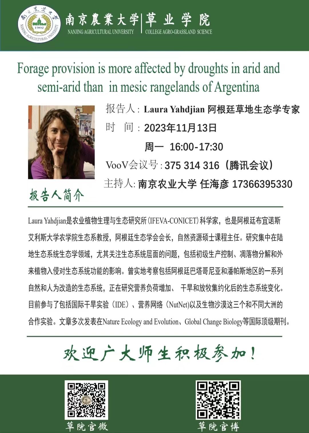 报告题目:Forage provision is more affected by droughts in arid andsemi-arid than in mesic rangelands of Argentina