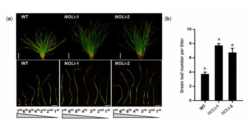图1 LpNOL进化树分析和定位情况亚细胞定位结果显示LpNOL在衰老叶片中高表达(图1,C)。在本氏烟草中瞬时过表达LpNOL能够加速叶子衰老和叶绿素b的降解。研究者通过RNA干扰,获得LpNOL敲除的转基因植株。研究者发现LpNOL基因的缺失会导致黑麦草保持绿色,并且延缓了叶片衰老的开始和进程(图2)。由此可知,LpNOL除了与叶绿素降解有关外,还可能通过多方面的代谢过程调控叶片衰老。