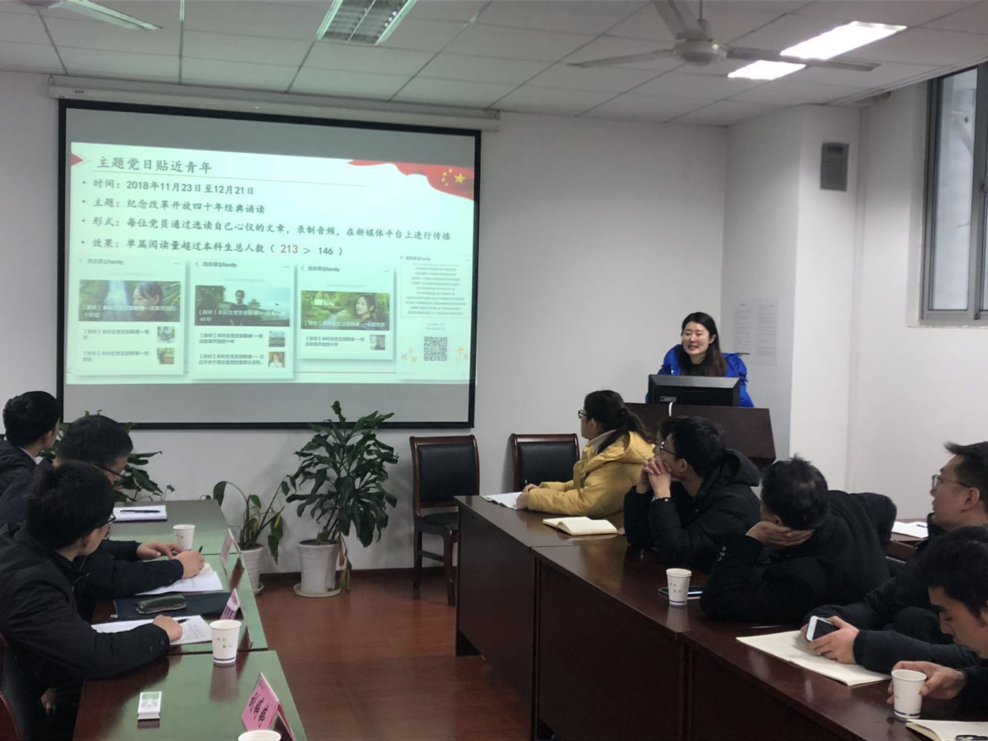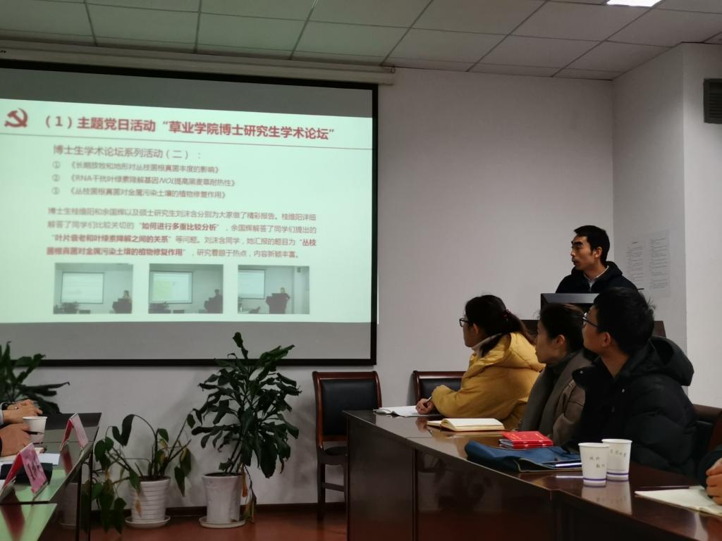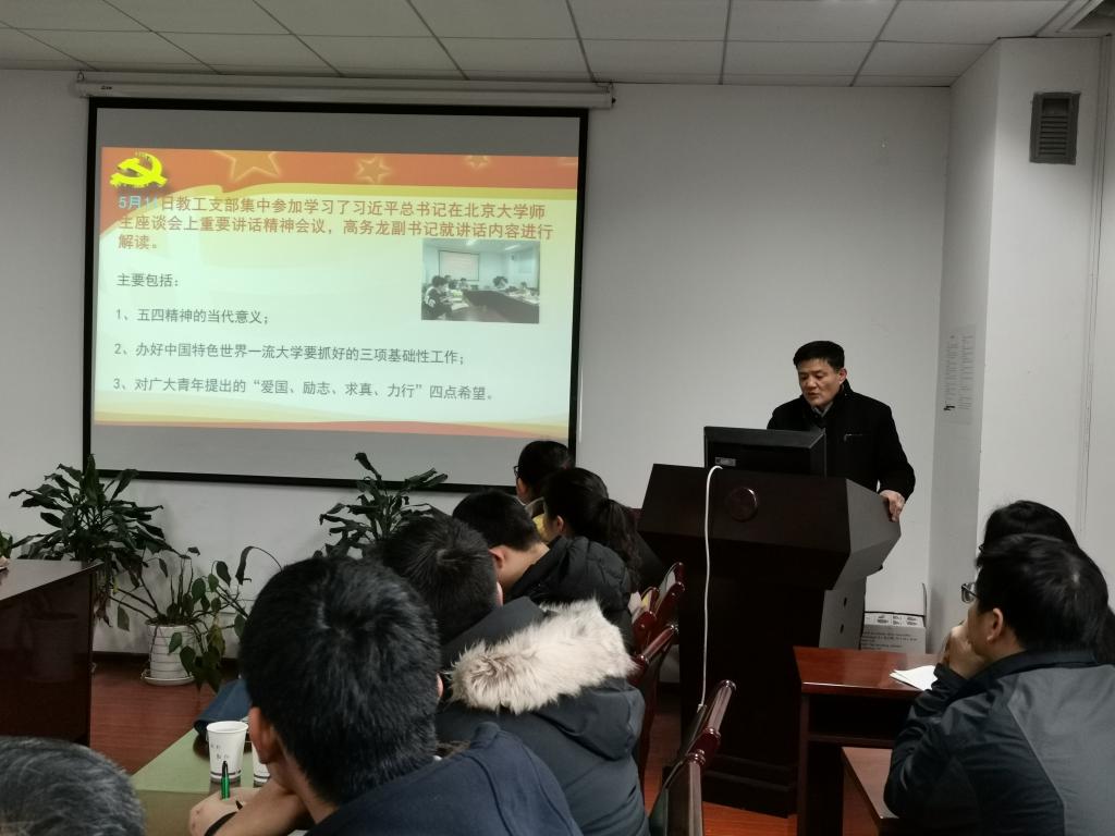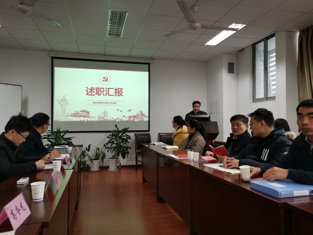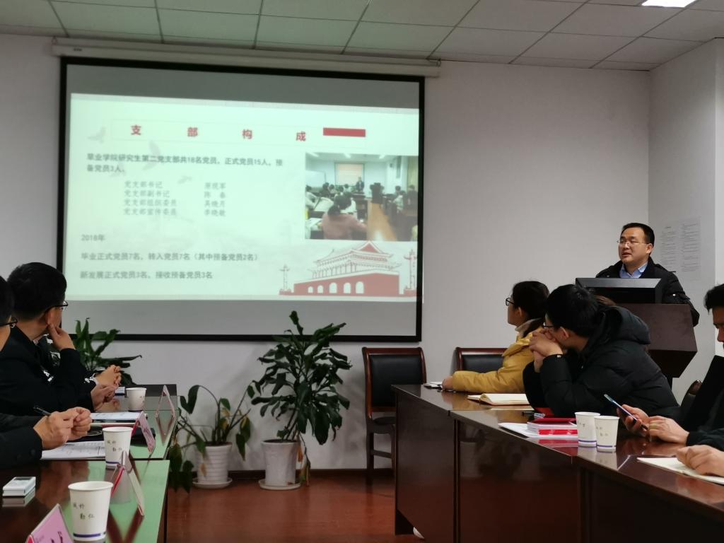 教工党支部书记邵涛、研究生第一党支部书记张敬、研究生第二党支部书记原现军、研究生第三党支部书记刘君和本科生党支部书记武昕宇依次就各支部一年的工作进行总结汇报。重点从“三会一课”开展情况、“最佳党日”活动情况、党员发展工作情况、存在不足与未来工作展望等方面展开介绍,列事实摆数据,用图文并茂的形式汇报了一年的工作情况。