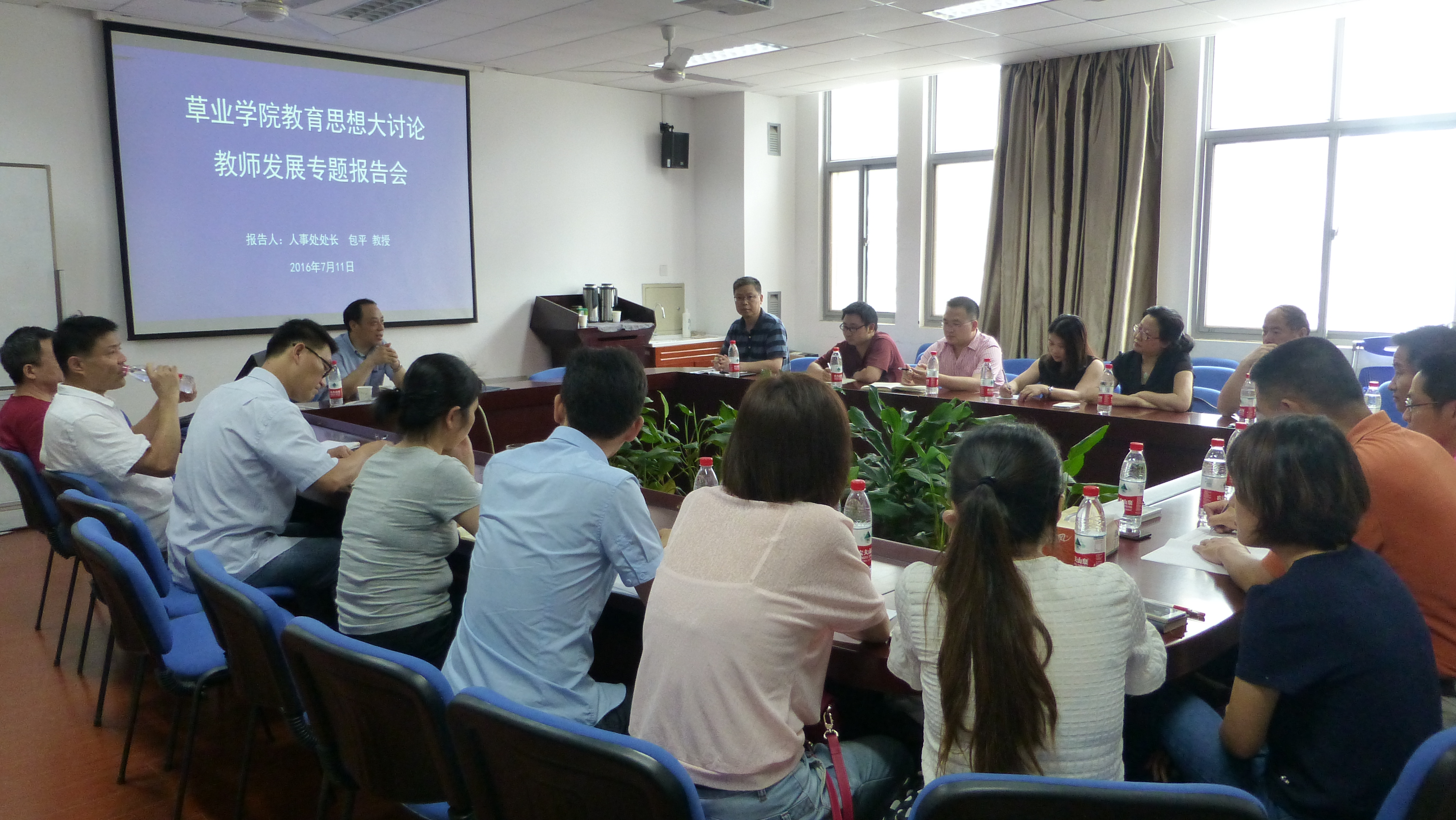 2016年7月11日下午,国产探花 在理科南楼院会议室举办教育思想大讨论教师发展专题报告会。报告由人事处处长(人才工作领导小组办公室主任)包平教授主讲,国产探花 党总支书记李俊龙主持,国产探花 全体教职工参加了报告会。 包平报告分三部分:一是回顾了2014年以来国家事业单位人事管理改革的相关政策,重点解读了《事业单位人事管理条例》以及相关文件精神;二是介绍了学校和国产探花 教师队伍的基本情况和发展现状,分析了师资队伍的优势和存在的问题;三是结合学校即将出台的人事制度改革办法,从岗位设置、聘用制度、考核与晋升、薪酬制度设计等方面进行了详细的解读。