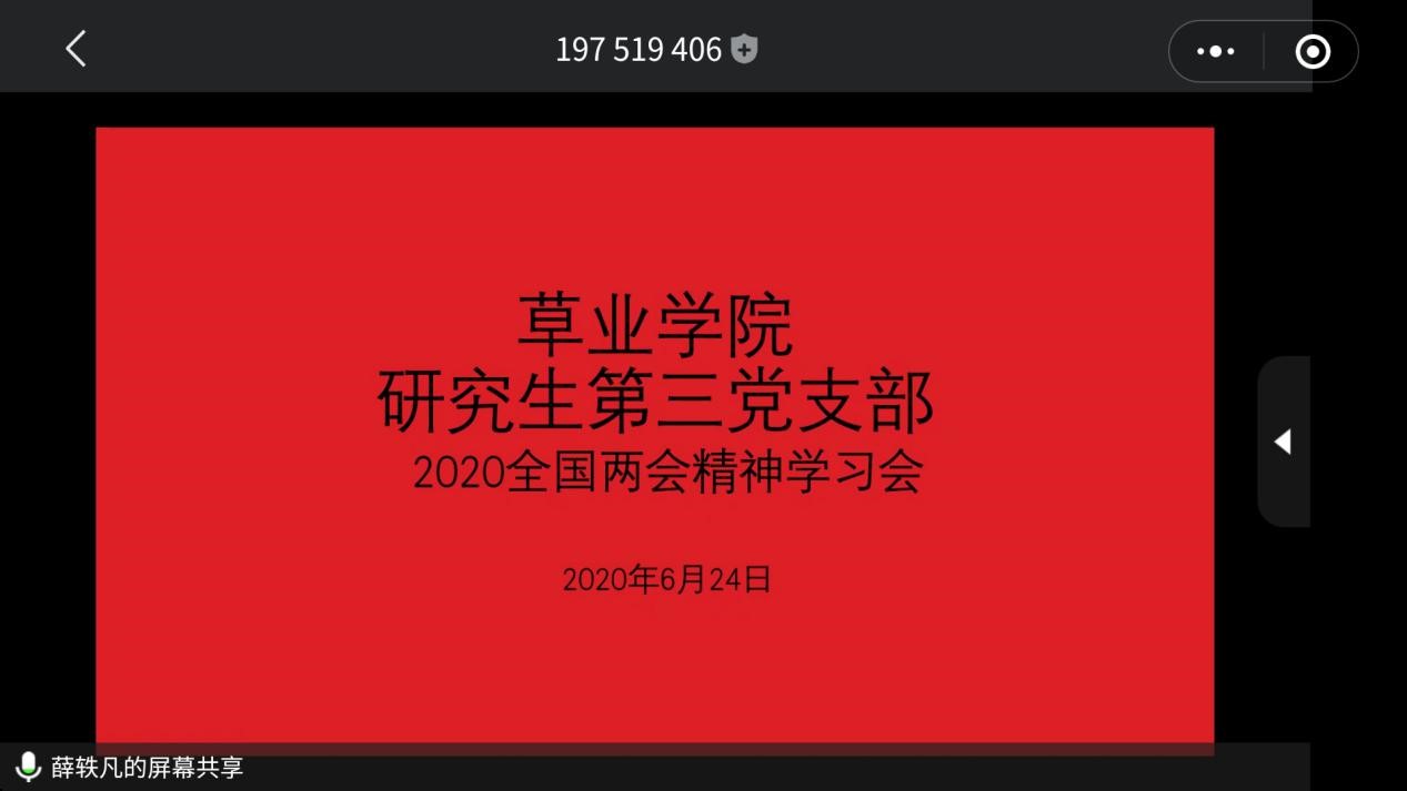 研究生第三党支部通过腾讯会议在线上开展了“解读2020全国两会精神”的主题学习会,会议主要学习了党的十九届四中全会精神。会议由支部书记赵娜主持,支部全体党员同志参加会议。