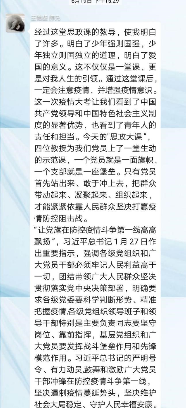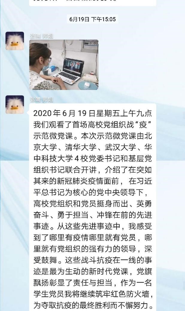 第三党支部党员群中积极发表学习心得,并附上记录学习过程的照片。首场高校党组织战“疫”示范微党课的线上学习活动圆满结束。