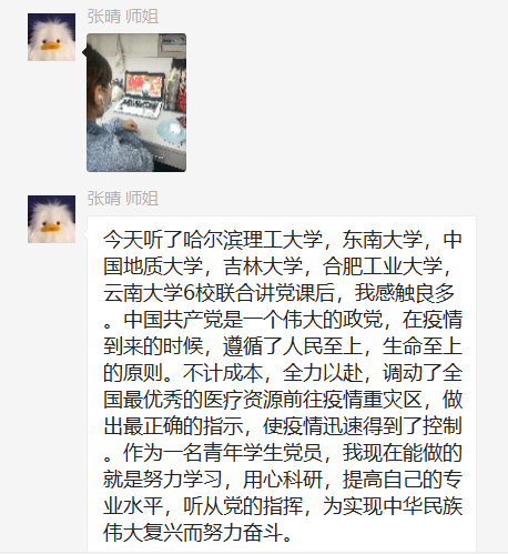 第三党支部各师生党员按例以线上自行学习方式第一时间认真收看战“疫”示范微党课。