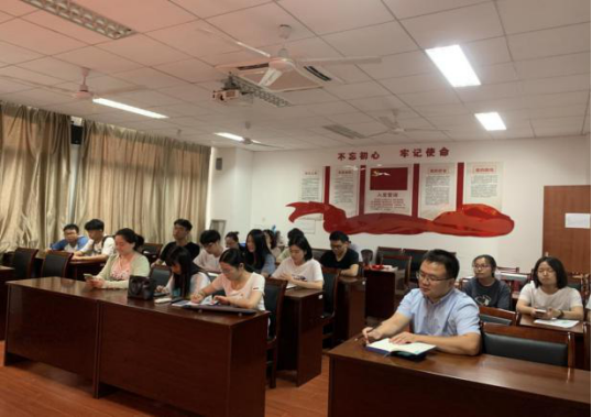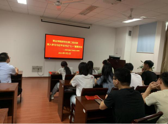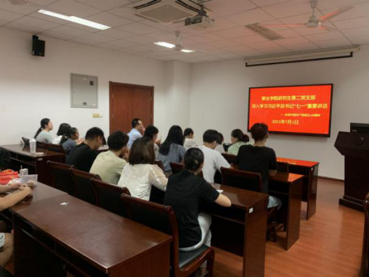 研究生第二党支部书记原现军同志组织支部党员及入党积极分子学习习近平总书记在庆祝中国共产党成立100周年大会上的重要讲话精神。