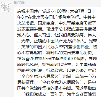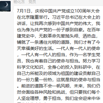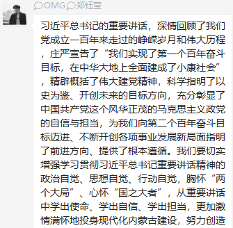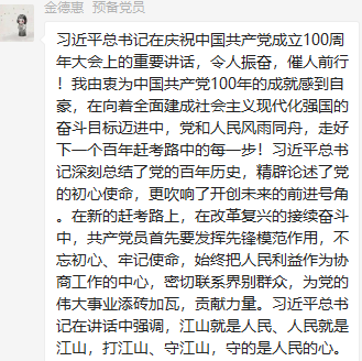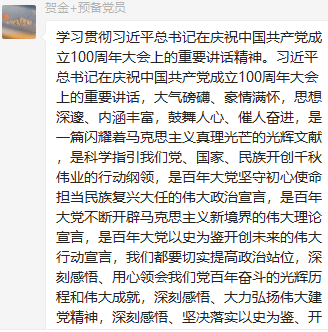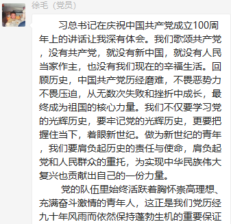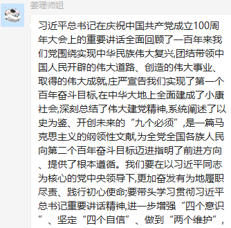 董瀛潞同志在国产探花 研究生第三党支部党员群中分享了与习近平总书记在庆祝中国共产党成立100周年大会上的重要讲话相关的资料和视频,党支部各党员在群里积极发表学习心得。中国共产党的先驱们不怕牺牲、英勇斗争,开创了中国历史新纪元。我们要继续弘扬光荣传统、赓续红色血脉,永远把伟大建党精神继承下去并发扬光大。作为新时代的青年党员,我们要以实现中华民族伟大复兴为己任,牢记“请党放心、强国有我”的铮铮誓言,长志气、有骨气、添底气,成为堪当民族复兴重任的社会主义建设者和接班人。