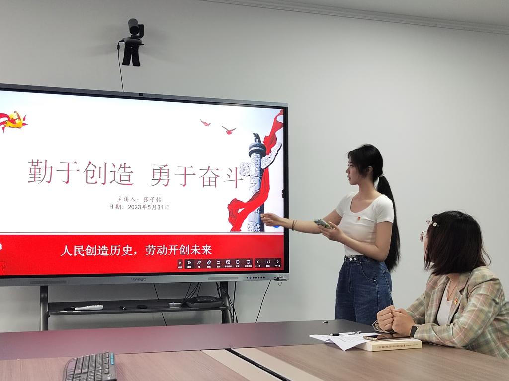 然后,张子怡同志进行了题为“勤于创造,勇于奋斗”的微党课分享。长期以来,在党的领导下,全社会奏响“光荣属于劳动者,幸福属于劳动者”的强音,培育形成崇尚劳动、热爱劳动、辛勤劳动、诚实劳动的劳动精神。这是我们的国家、我们的民族风雨无阻、勇敢前进的强大精神动力。奋进强国建设、民族复兴的新征程,在全社会弘扬劳动精神,意义重大而深远。张子怡同志以王崇伦和田桂英的劳动故事,生动地为大家讲解了劳动精神是鼓舞全党全国各族人民风雨无阻、勇敢前进的强大精神动力。新时代的今天,劳动精神不仅没有过时,而且越发凸显出现实意义和时代价值,激励着更多劳动者特别是青年一代走技能成才、技能报国之路,在奋力奔跑和接续奋斗中成就梦想。