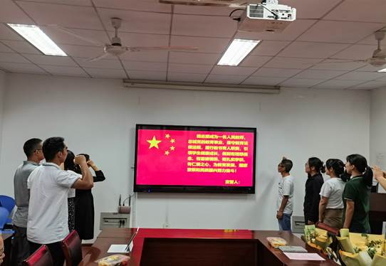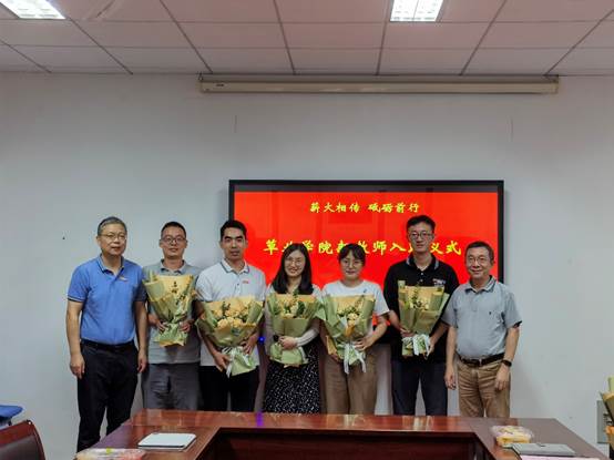 活动的第一个阶段举行了新教师入职仪式,学院近三年新入职教师先进行了自我介绍,并行了交流,荣休教师沈益新教授为新教师佩戴校徽,院领导向新进青年教师送上鲜花献并鼓励青年教师要肩负教书育人职责,坚守立德树人初心,努力成为党和人民满意的“四有”好老师,努力在教学科研、人才培养等方面做出更大成绩,为学院的发展贡献力量。最后,新进教师进行了入职宣誓。