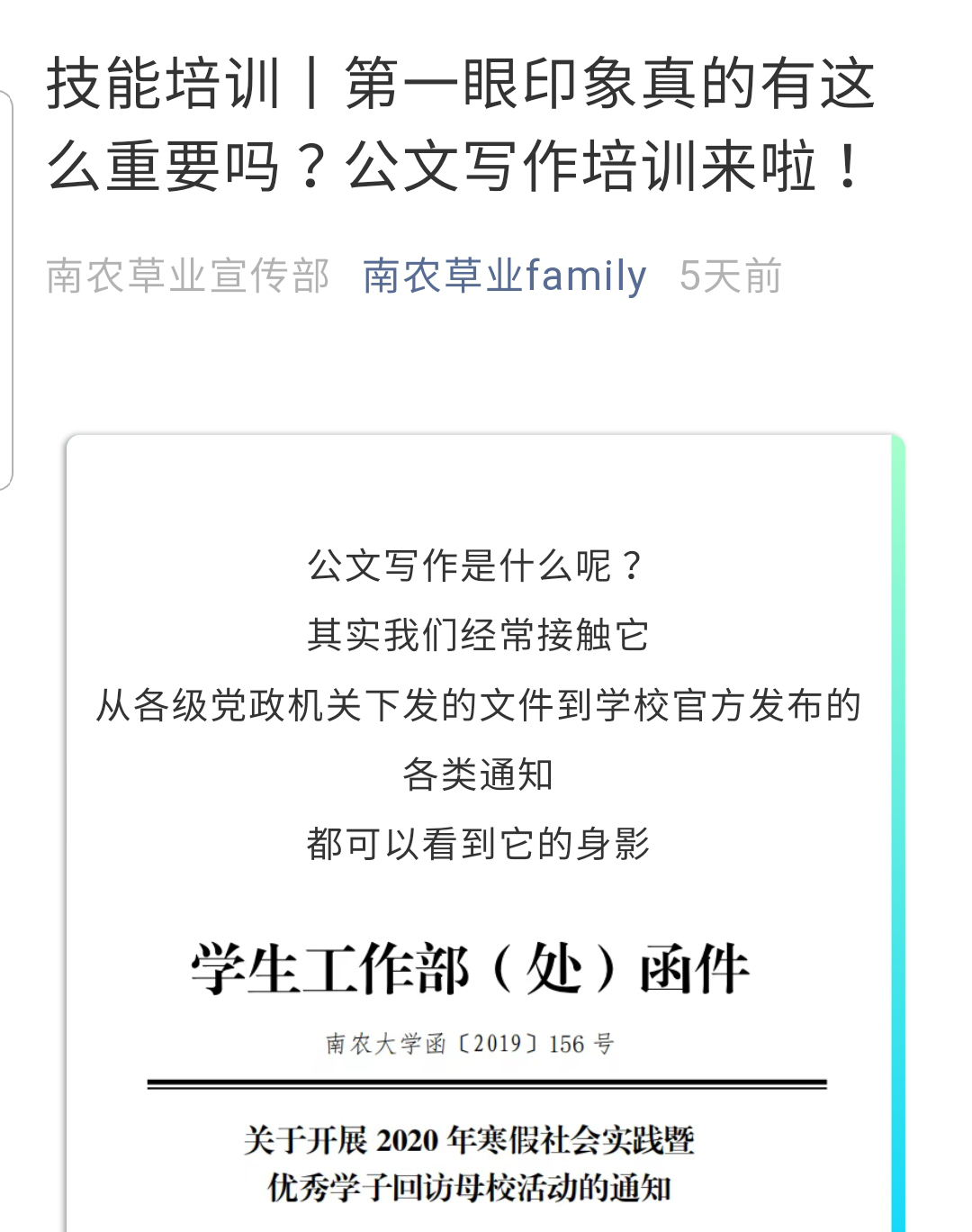 团委学生会干部的公文写作技能与工作能力,促进学院党团组织与班级的发展与建设,学院在草业Family公众号上以推送形式开展公文写作技能培训。