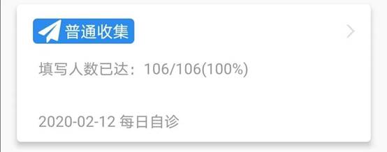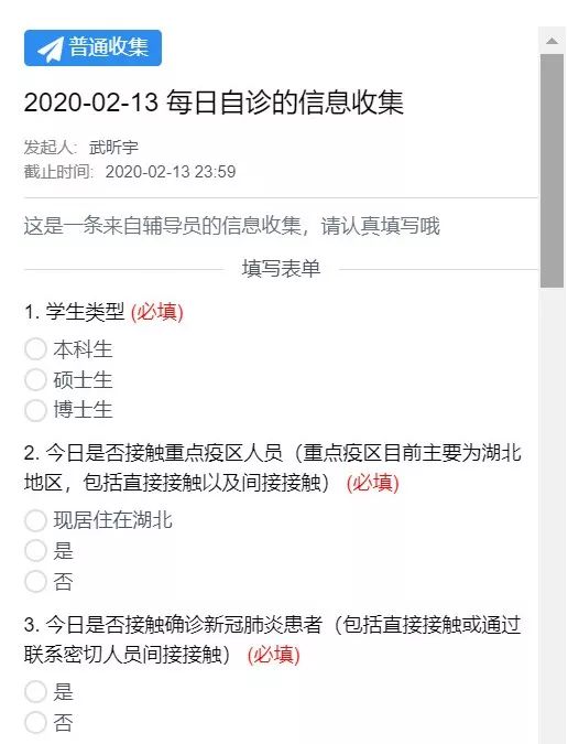 早晨8:00,手机传来了短信提醒“嗨~你的老师发来了一条(信息收集)《2020-02-13 每日自诊》,请尽快打开今日校园APP查看!” 这是研究生辅导员武昕宇每日发起的自诊任务。