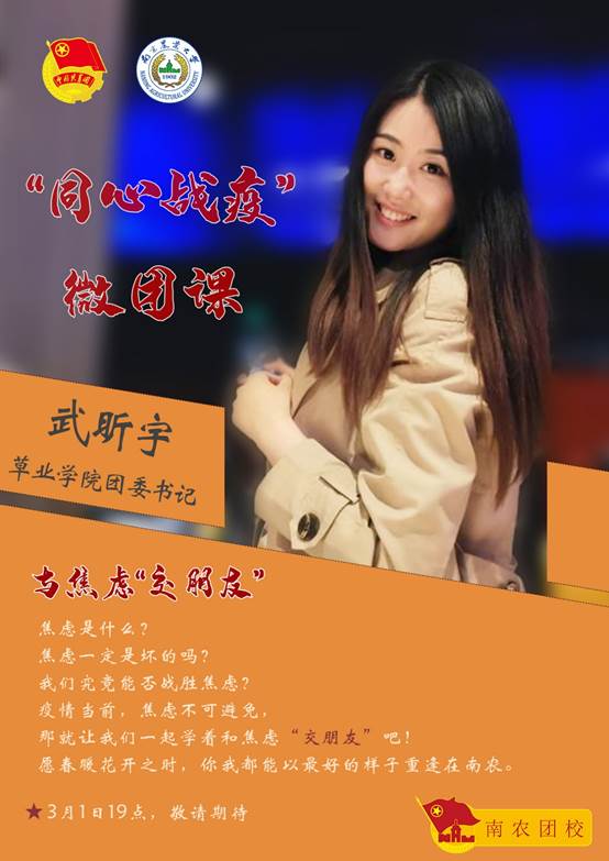 党旗所指,团旗所向。自疫情爆发以来,南农团委按照学校党委和上级团组织有关部署,引领广大青年积极落实各项疫情防控措施。为了帮助南农学子克服焦虑情绪,调节心态全身心投入新学期的学习生活,我们特别邀请到了草业院团委书记武昕宇老师,为南农师生精心打磨一堂线上战微团课,教大家在疫情面前,学会与情绪和解,与焦虑交朋友