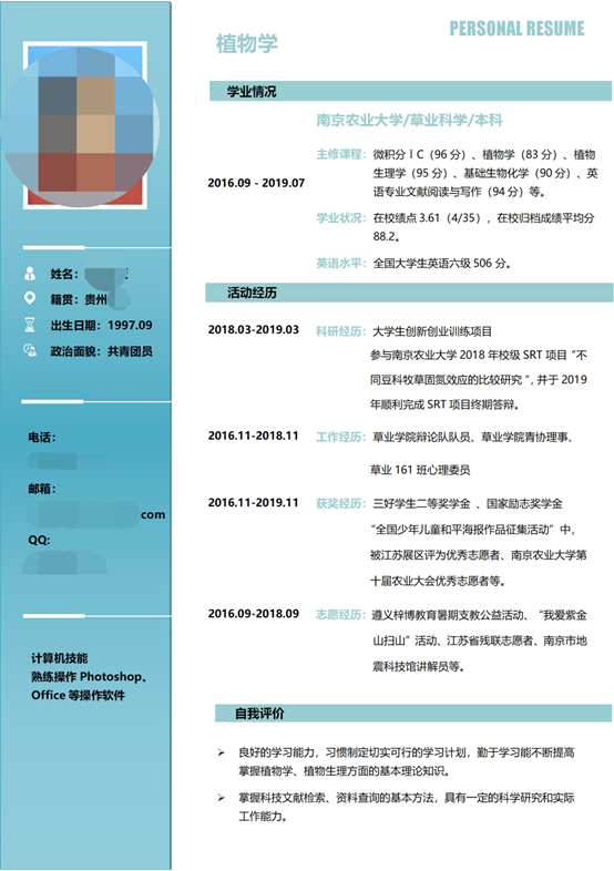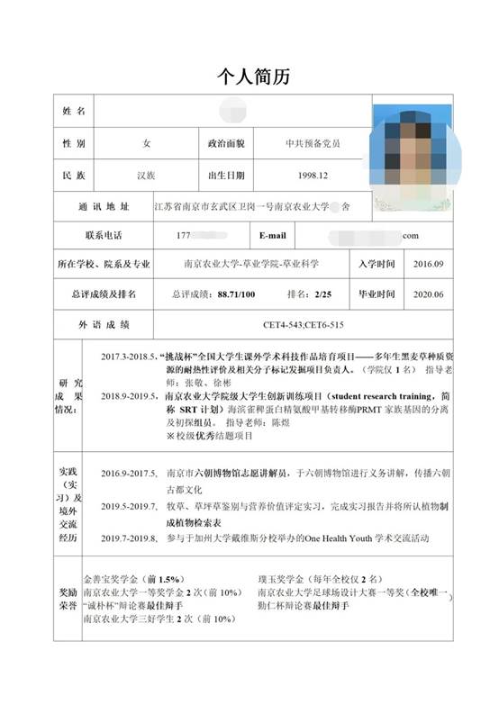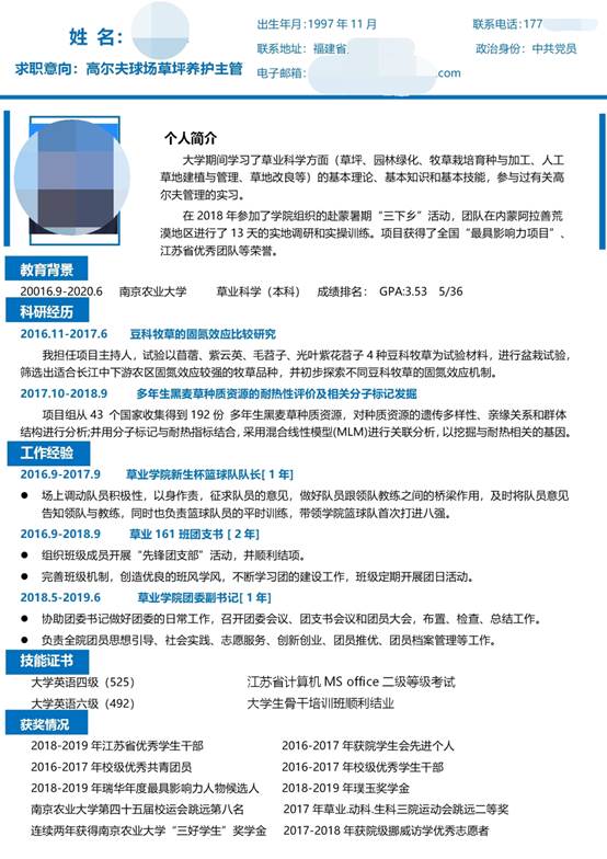 时光飞逝,转眼又是一年的毕业季啦,不知道各位即将毕业的小伙伴们有没有拿到心仪的offer呢?有的同学说,我的简历还没有做好呢,怎么办呢?别急,这里有来自草业161班即将毕业同学的3份优秀简历,一起来看看吧!