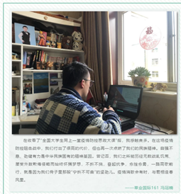 疫情期间,大部分同学主动居家隔离,自我保护,完成了另一种奉献,除了完成疫情防控”思政大课“,同学们也用艺术作品完成了自己对武汉的美好祝愿。