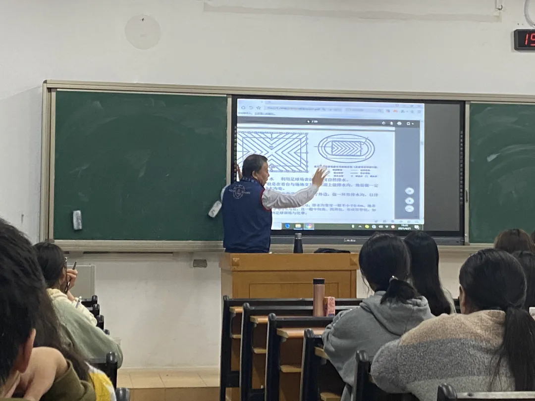 紧接着,杨教授为同学们讲解了规划书的具体要求,将总体分为文本与图纸两方面。针对排水系统、灌溉系统、草坪草种的设计,以及施工方案的编制等基本问题,杨教授都进行了细致的介绍。对草种的选择、如何获取品种详细信息等与大赛密切相关的问题也做出了解释。