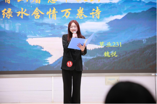 各位选手演讲完毕,崔滢对本次主题演讲点评。她首先表扬了所有参赛选手的精彩表现,紧接着就“演讲”分享了自己的见解。她从演讲的目的、如何演讲两方面展开,强调了演讲讲究“形神兼备”,演讲过程要注重精神风貌与语言技巧,对此她肯定了参赛选手所表现出来的坚定自信、有青春活力的草业风貌。最后,崔滢也对大家表达殷切期望,希望大家未来能够继续为建设美丽中国,贡献自己的青春力量。