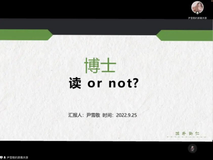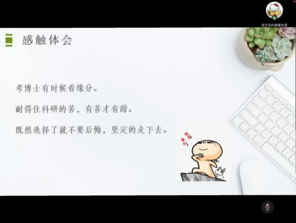 她从考博前期准备和考博注意事项等两部分分享了自己考博的历程和心得。她分享了自己在备考过程中获取信息的来源渠道,强调了笔试和面试时要注意的事项。她说勉励大家要耐得住科研的苦,有苦才有甜。