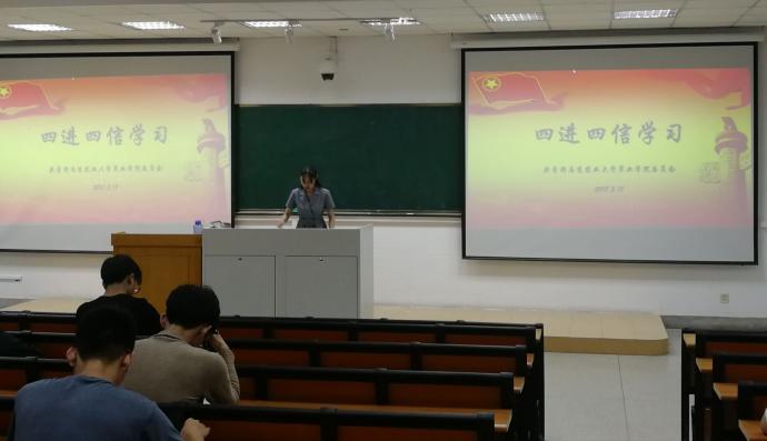 2018年5月18日晚8:30,国产探花 全体本科生于教学楼C301进行了关于"四进四信"的集体学习。本次集体学习由国产探花 团委副书记储晨主持,出席的老师有国产探花 党委副书记高务龙。