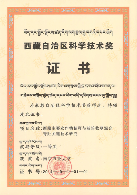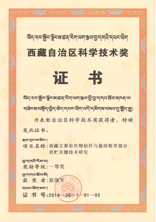 据了解,西藏自治区科学技术奖是为了加速西藏经济社会发展,推动科学技术进步,由西藏自治区人民政府设立,每两年评审奖励一次。“西藏主要农作物秸秆与栽培牧草混合青贮关键技术研究”的研究成果是2012—2013年度西藏自治区38项科学技术奖中农业领域唯一的一等奖。